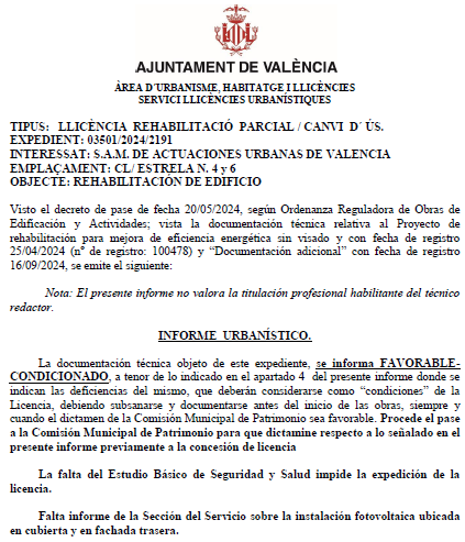 The favorable report of Heritage and favorable license conditional for the execution of the intervention work in the building has been obtained.